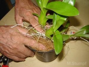 plantando a muda de orquídea7 – Colocar a planta delicadamente, fixando-a com pedaços de arame curvos.